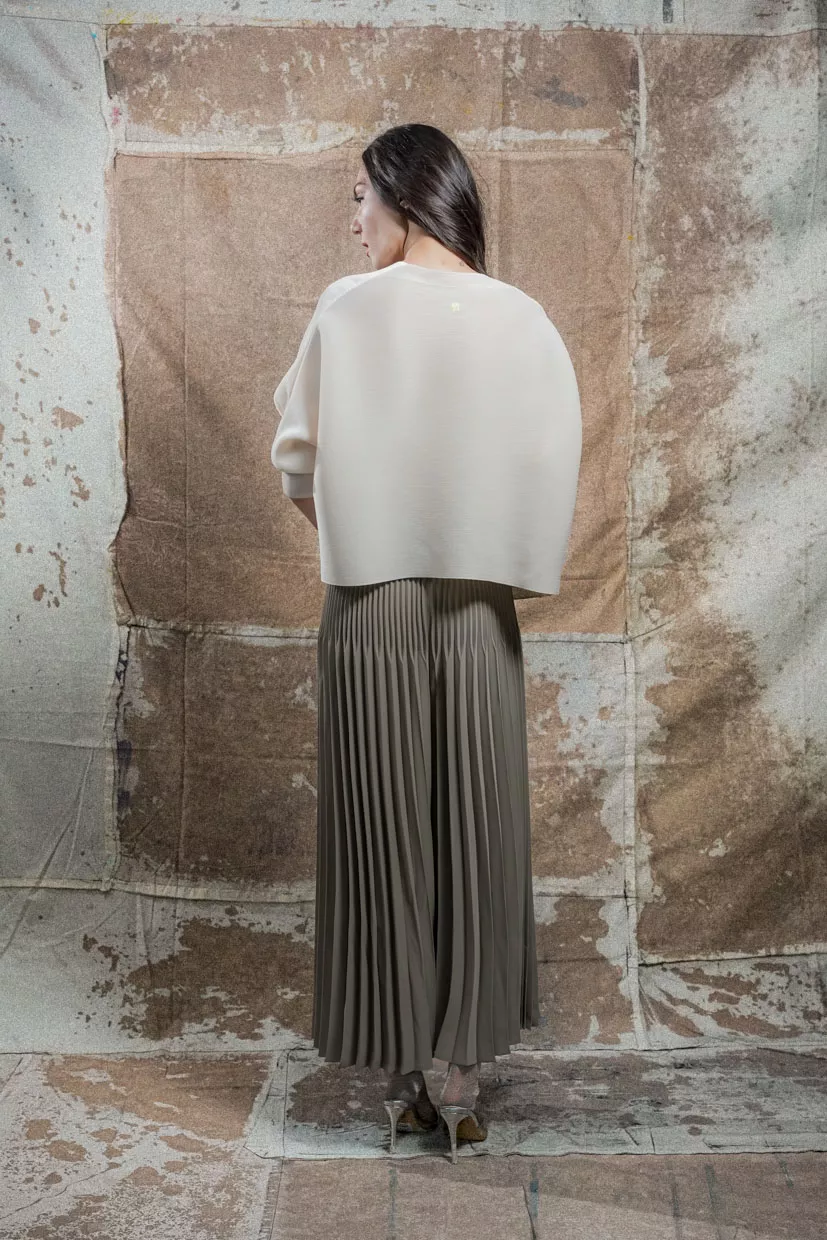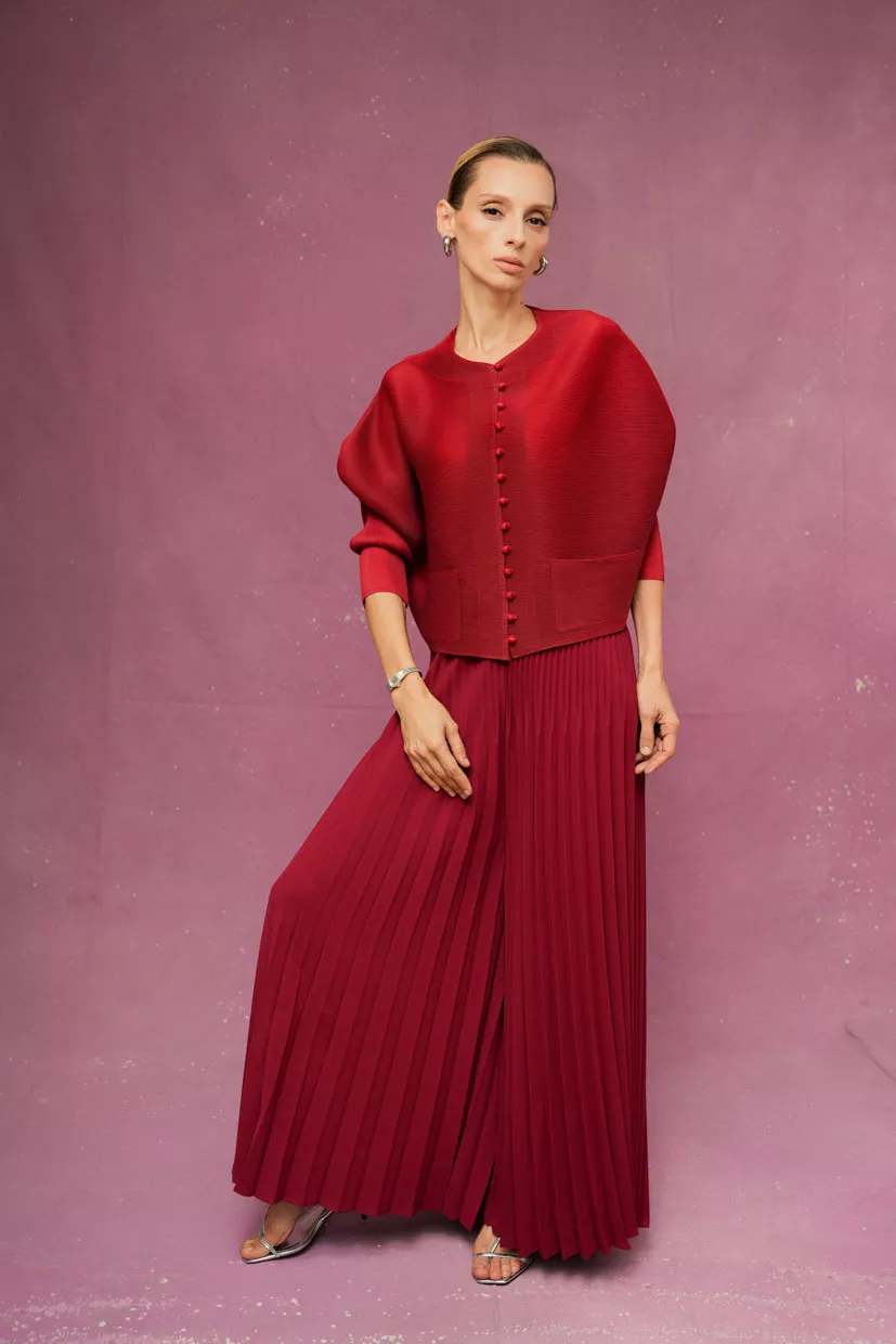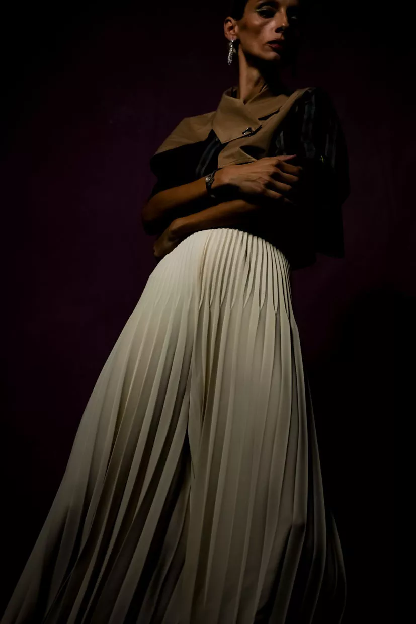 The Belcourt Pants feature graceful pleats and a wide-leg silhouette that pairs perfectly with fitted or cropped tops to balance the volume. Style them with heels or sleek flats for a polished finish. Tonal layering and minimalist accessories complete the modern look.