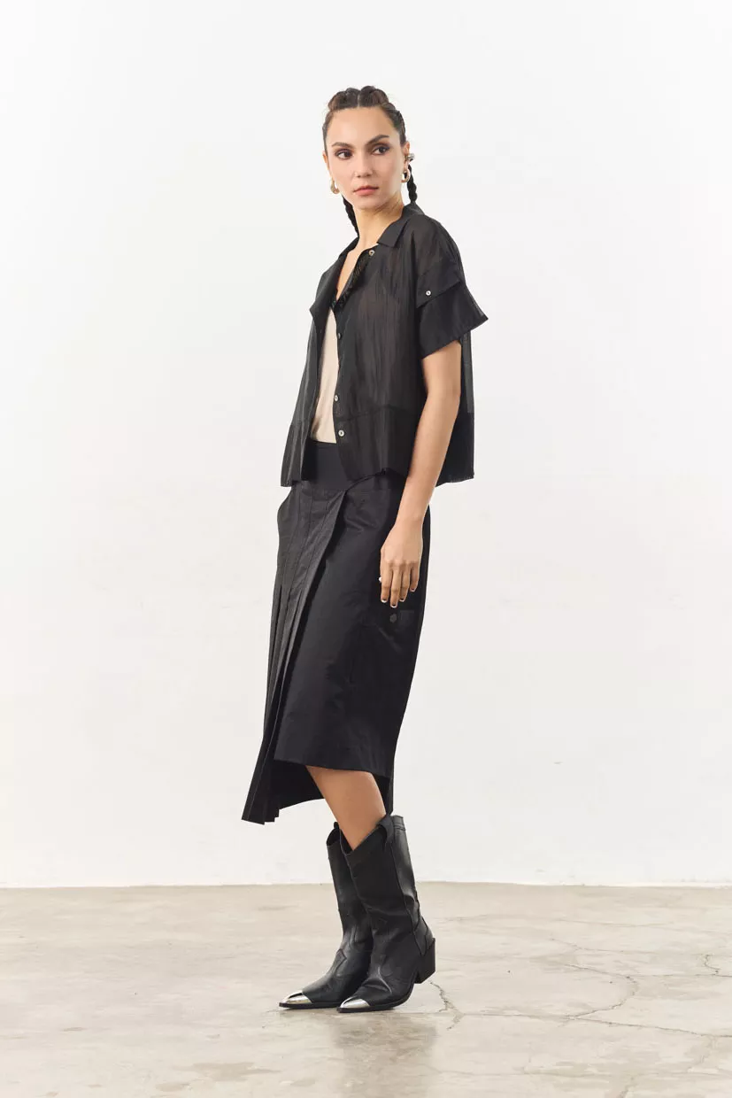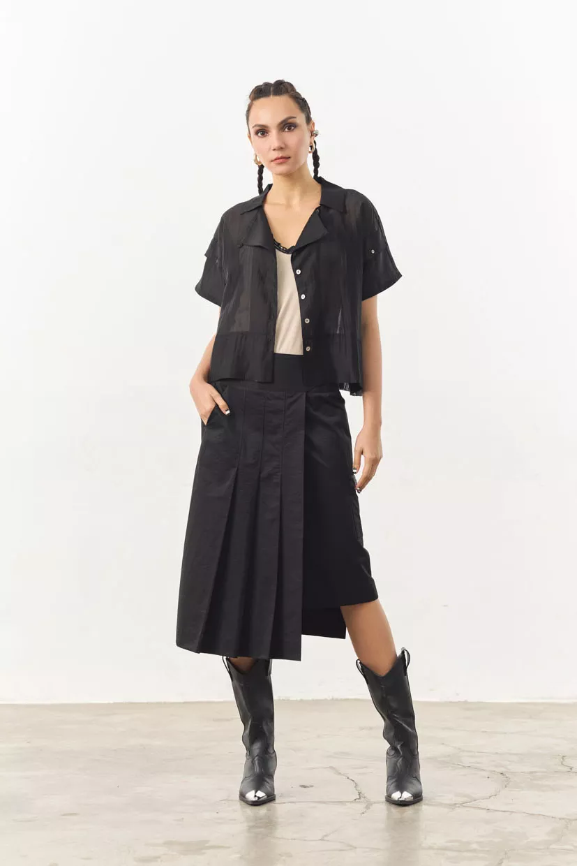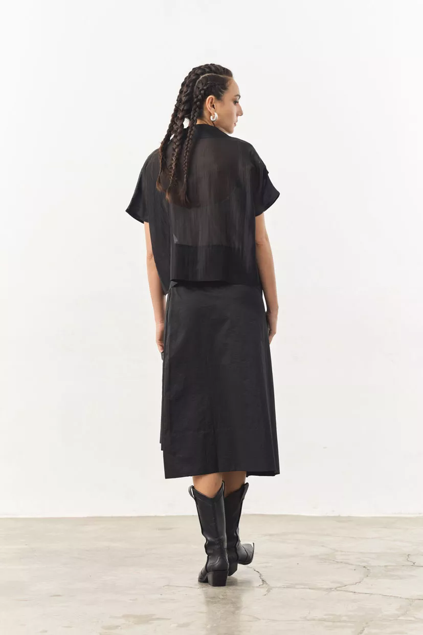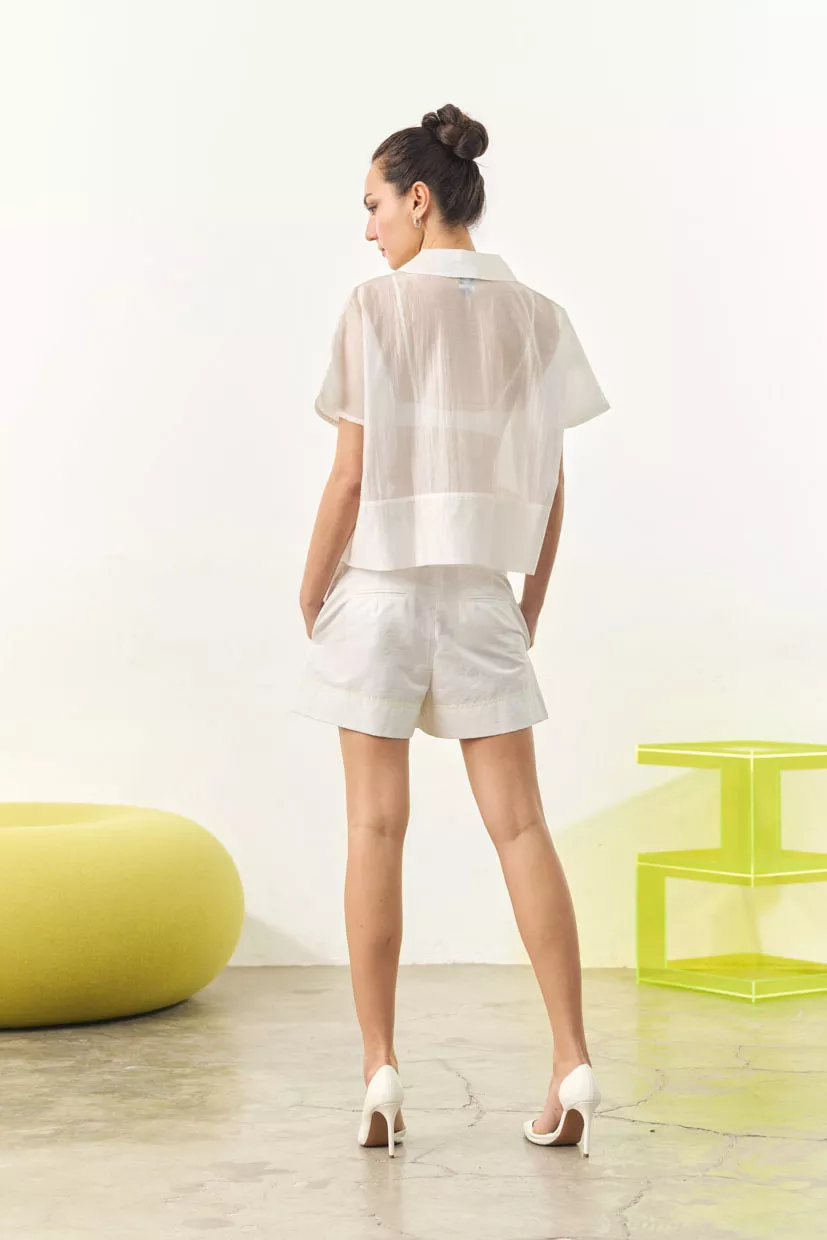 Cameron turns sheerness into function: a lightweight shirt that works on its own or as an elevated layer over slips, trousers, or matching sets. Its transparency gives dimension, making even the simplest styling feel considered.