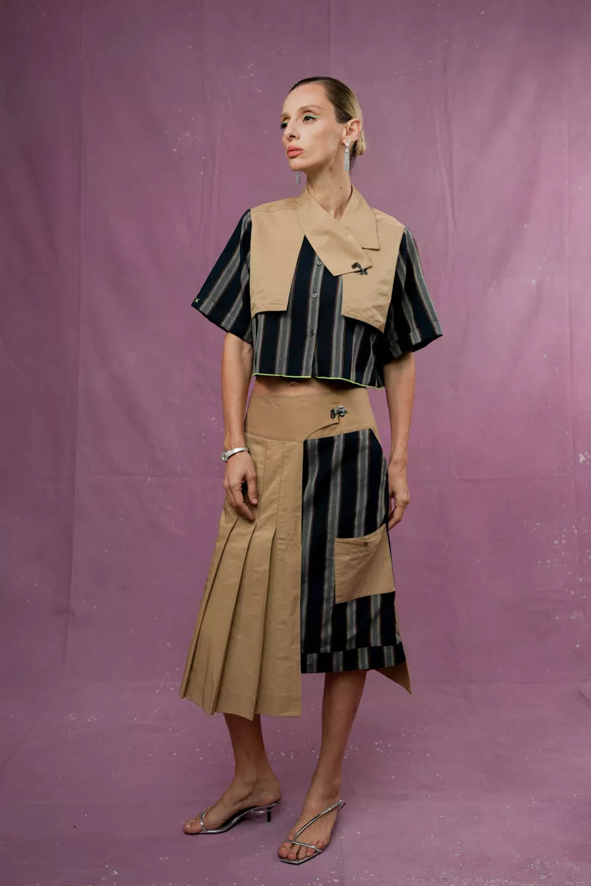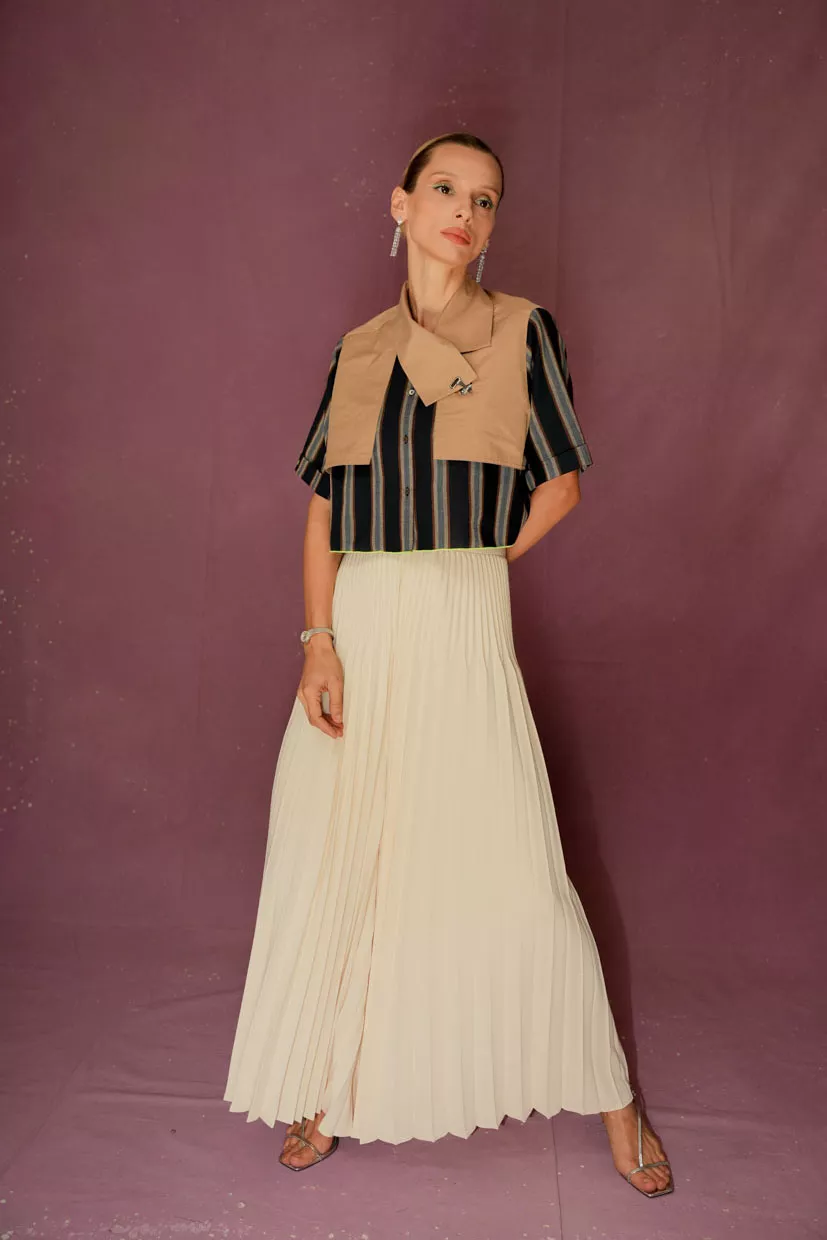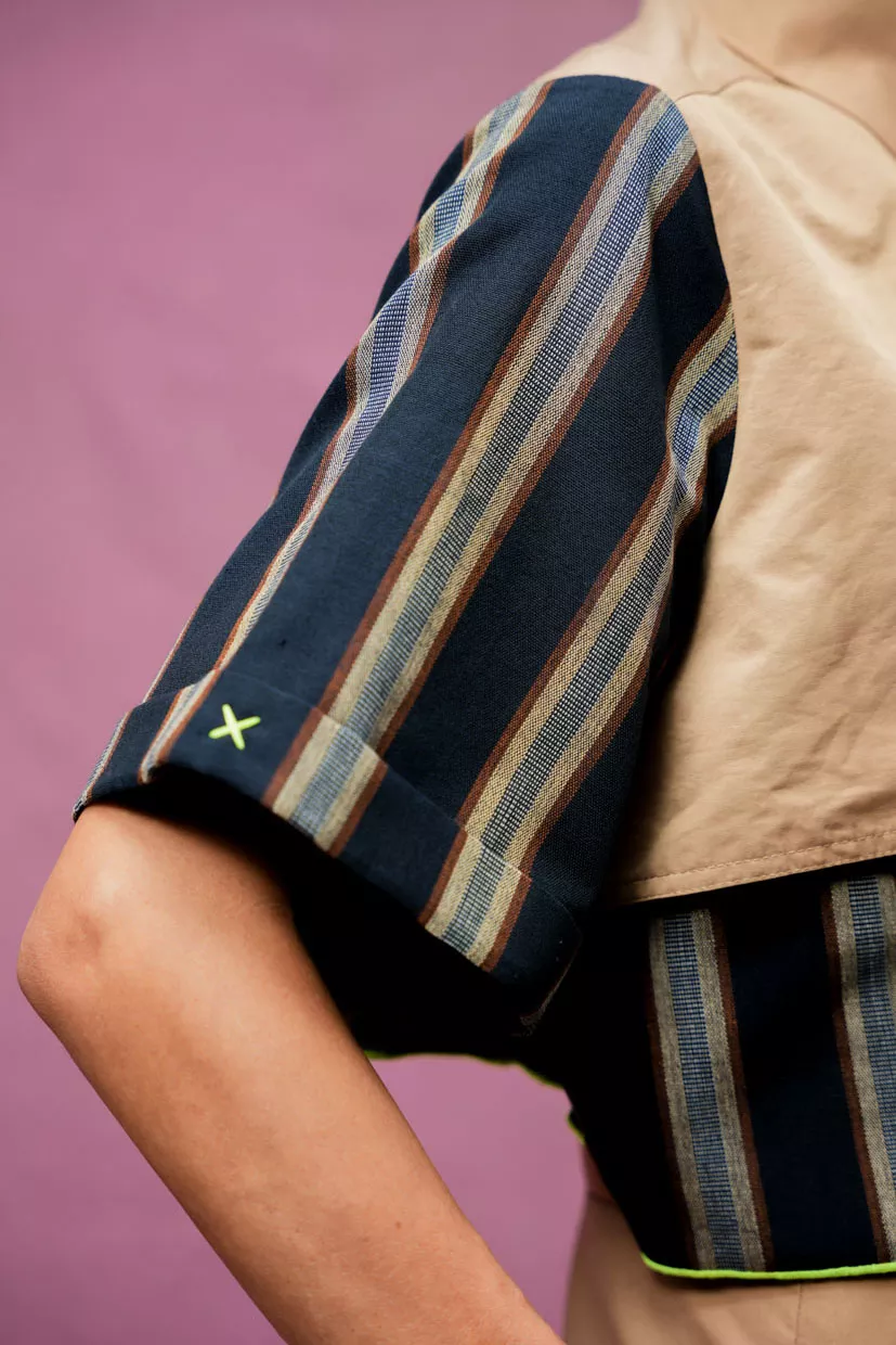 Produced in limited quantities using indigenous handwoven fabric, the Ceylon HL Top is best styled with simple bottoms to balance the cropped shape and allow the Handloom multi stripe pattern and panel detailing to take focus.