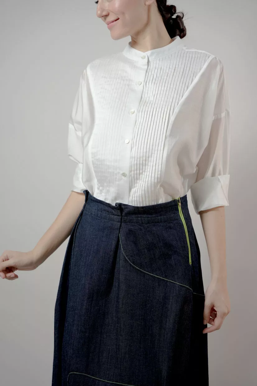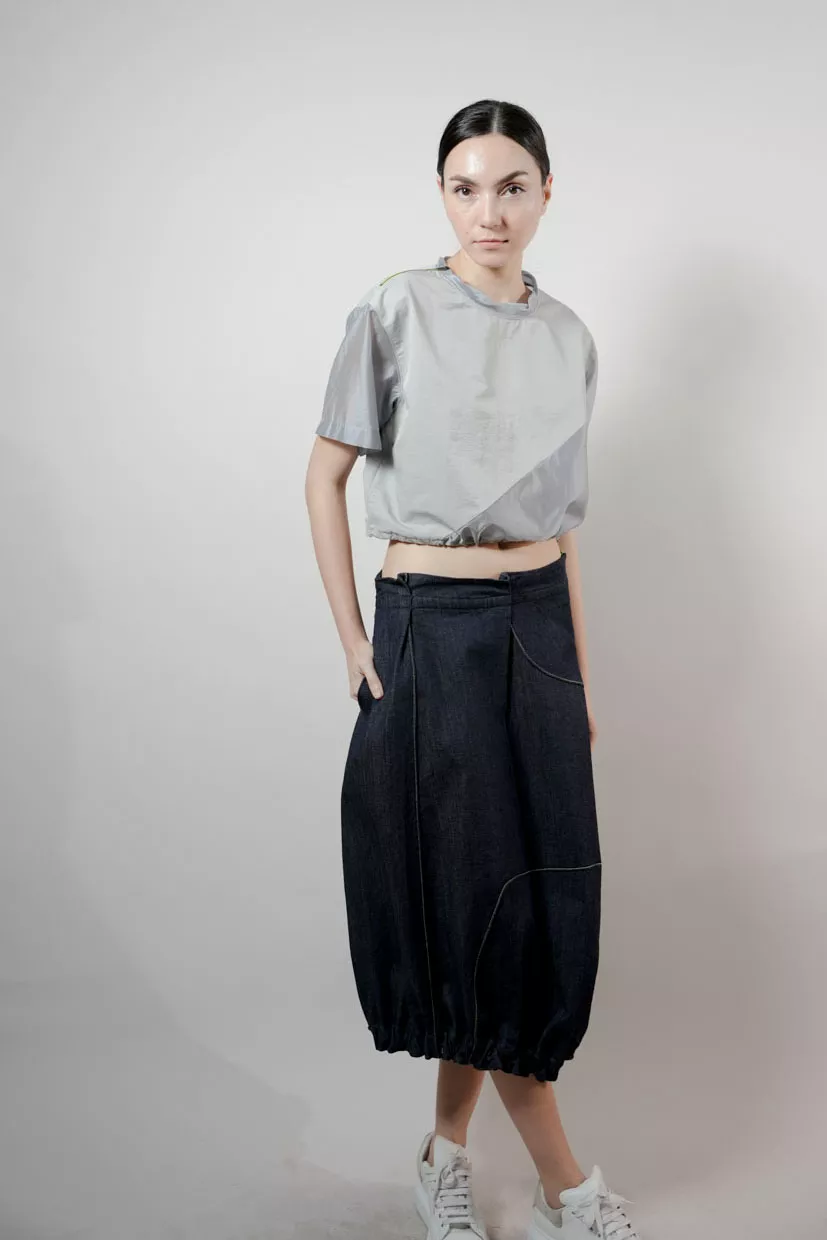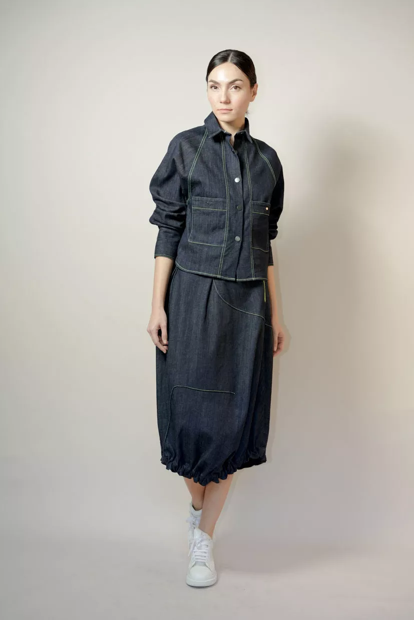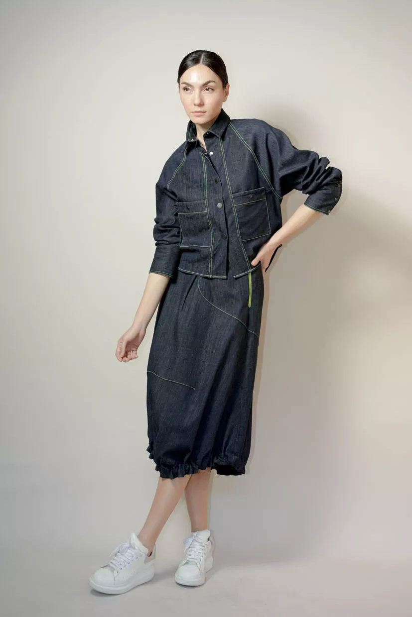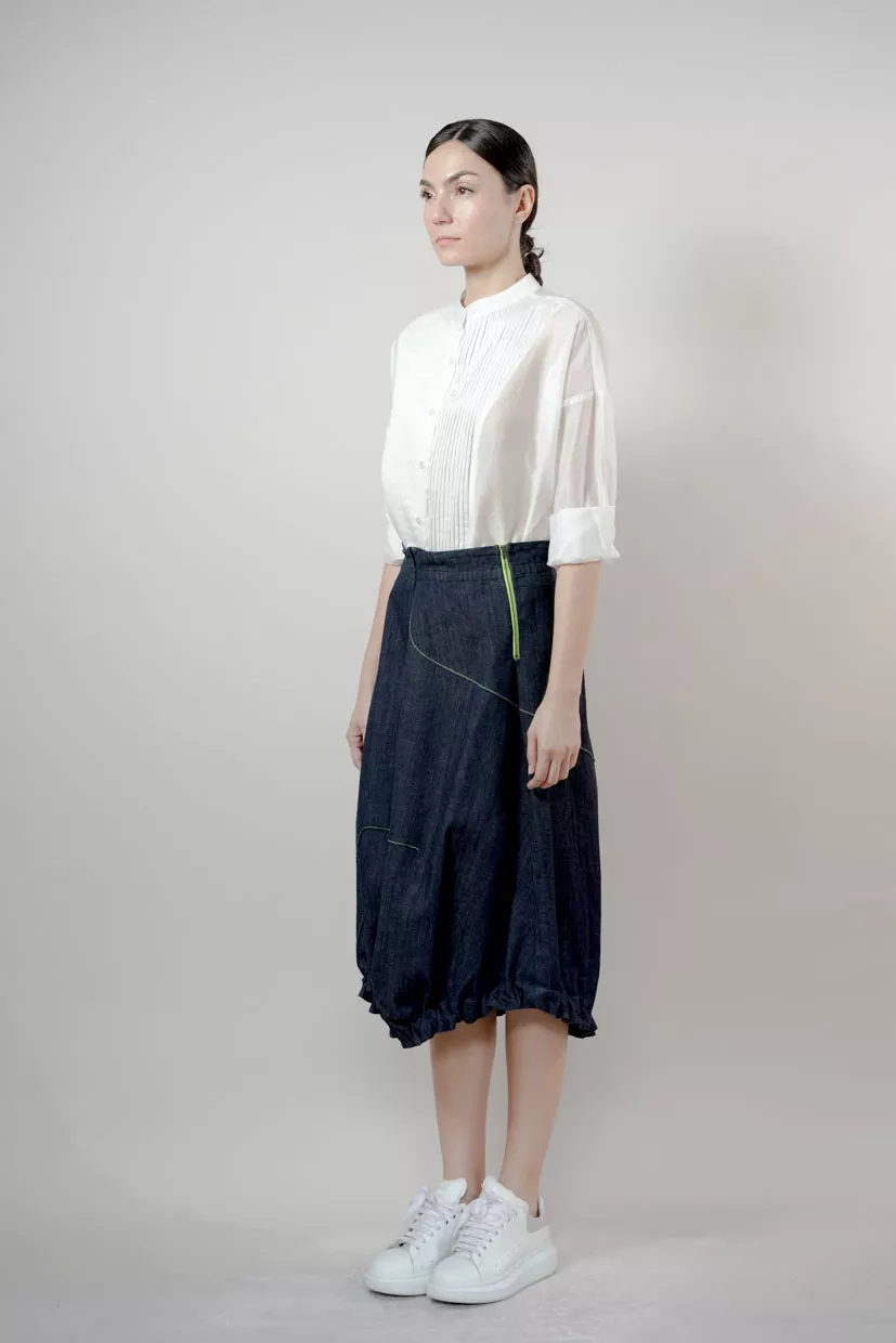 The Glenbrook Skirt reimagines a classic denim skirt with a sculptural bubble silhouette. Contrast stitching emphasizes its curved seams, while the neon green side zipper lends a bold, unexpected twist. Designed to sit at the waist, it moves easily from casual tees to structured tops, offering a playful yet polished look.
