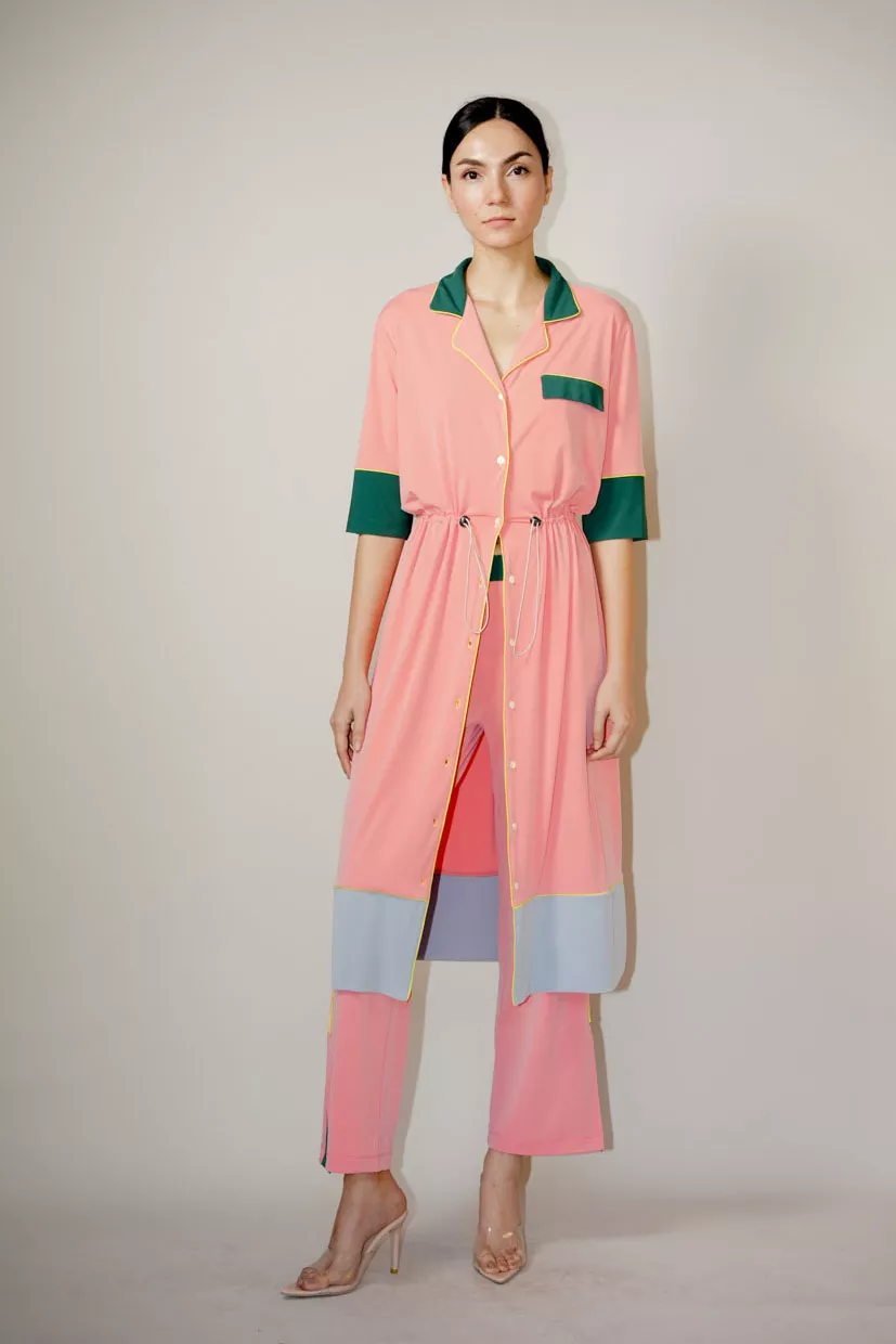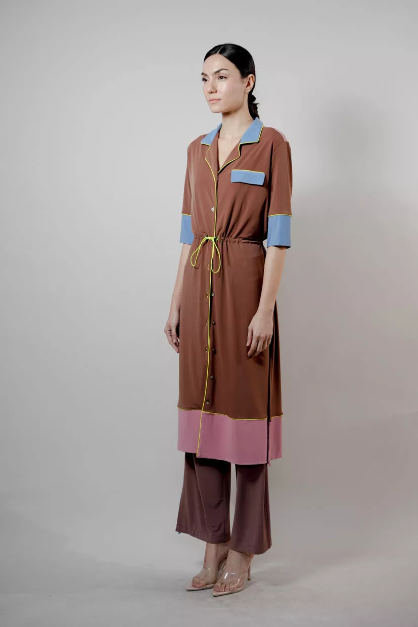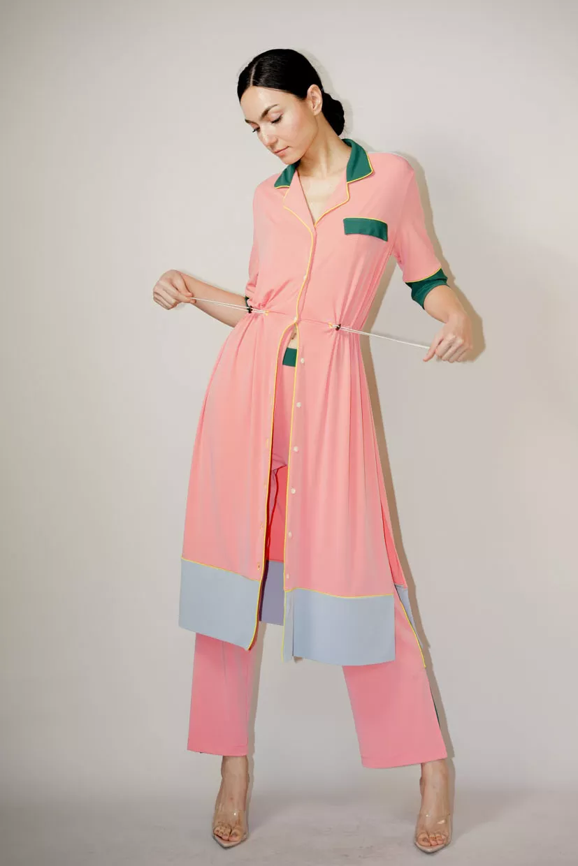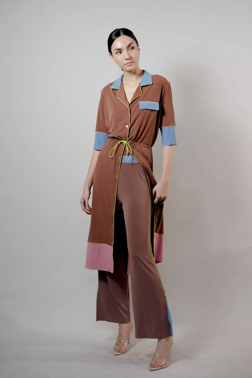 The Hines Dress was designed to feel just as polished as it does effortless. Cinch the waist for definition or leave it relaxed for ease. Its piping and lines bring visual interest, and when layered with Logan Pants, it creates a modern, unexpected silhouette.